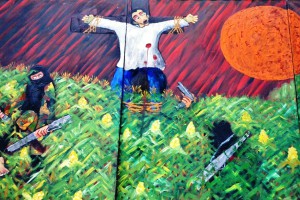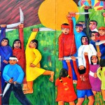 Un giovane appare crocifisso e dietro di lui un sole di colore arancione è puntellato da macchie di oscurità. E poi ci sono altre persone, gente minacciata. Un po’ appartati dalla scena, un gruppo di contadini a piedi nudi e un nugolo di bambini che tengono tra le dita i fili di alcuni palloncini, colorati con i toni della pace e della sua bandiera. Un po’ più avanti alcune chiome femminili, le teste di alcune donne, compaiono tra i palloncini. Sullo sfondo, dietro, è appeso al cielo un sole giallo, il sole vero che conosciamo, e domina la scena. Si susseguono decine di teste di donne senza i rispettivi corpi e ancora oltre ci sono braccia di ragazzini e bambini che spuntano dalla terra come se fossero fiori e permettono ai palloncini un libero volo nell’aria.