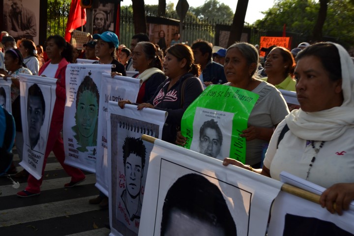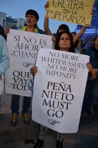 Il 5 novembre il centro della capitale è invaso da una massa animata e sfidante. Il grido di dolore dei genitori delle vittime della strage di Iguala del 26 settembre e dei desaparecidos entra in risonanza con la rabbia di studenti, professori, collettivi, ONG, sindacati, artisti, cittadini e lavoratori. Sfonda il torpore dei mass media, s’espande in mezzo mondo, mette in dubbio il ronzio fastidioso delle menzogne governative e propaga i suoi slogan, innalza i suoi cartelli, portatori di desolanti verità: #AyotzinapaSomosTodos (“Ayotzinapa siamo tutti”) e #Fueelestado (“La colpa è dello stato”) sono hashtag, scritte sui muri e striscioni che significano solidarietà e denuncia. E in effetti, anche se a fasi alterne e con diverse intensità, le proteste e le iniziative in Messico e in tutto il mondo non smettono di far parlare del “caso Iguala” e degli studenti della scuola normale rurale “Raul Isidro Burgos” di Ayotzianapa, la peggiore mattanza di studenti dopo la notte di piazza Tlatelolco a Città del Messico quando, il 2 ottobre 1968, l’esercito sparò sui manifestanti e fece oltre 300 vittime.