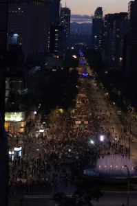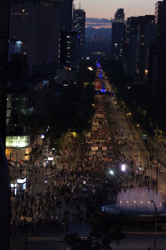 Un centinaio di migliaia di manifestanti marcia per le strade della città, dalla residenza presidenziale de Los Pinos al Zocalo, l’enorme piazza centrale, passando per la Avenida Reforma, per esigere al governo il ritrovamento dei 43 studenti della scuola normale di Ayotzinapa, stato del Guerrero, sequestrati nella notte del 26 settembre dalla polizia di Iguala e del vicino paese di Cocula e poi consegnati ai narcotrafficanti del cartello locale Guerreros Unidos. I dimostranti chiedono un giusto castigo per i responsabili della mattanza di tre studenti e altre tre persone commessa quella stessa notte e il ritrovamento dei desaparecidos. La terza giornata di azione globale per Ayotzinapa ha mosso coscienze da Torino a Padova, da Zacatecas a Londra e Strasburgo.