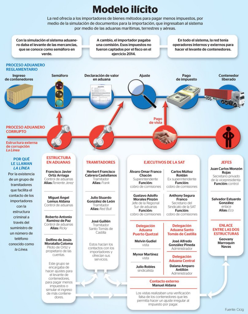 Gli indagati sono accusati di associazione illecita con fine di contrabbando, contrabbando doganale e frode tributaria. La CICIG calcola che gli incassi derivanti dagli illeciti commessi si aggirino attorno ai due milioni di quetzales settimanali (circa 240.000 €): una frode da centinaia di milioni. Per decisione del giudice Marta Sierra Stalling, sei dei venti arrestati sono già stati rilasciati e si trovano al momento in libertà provvisoria, nonostante tra questi vi siano figure identificabili come i leader del meccanismo fraudolento. In particolare, si tratta di Salvador González Álvarez e di Francisco Javier Ortiz Arriaga. Il primo è rappresentante dell’importante consorzio di mezzi di comunicazione Corporación de Noticias S.A., società guatemalteca che controlla i quotidiani nazionali Siglo XXI e Al Día, mentre il secondo è un veterano del contrabbando. Egli stesso nelle intercettazioni telefoniche eseguite nel corso dell’indagine afferma di avere “oltre diciotto anni d’esperienza in frodi fiscali”.[6] Si tratta infatti di un integrante della Red Moreno, CIACS nato negli anni ’70 e composto da ufficiali dell’esercito e funzionari governativi, per scopi di controllo doganale, poi utilizzato per vere e proprie azioni di contrabbando. Durante il governo di Álvaro Arzú (1996-2000) ebbero inizio, però, le indagini che portarono allo smantellamento della Red. Nel 1996 Ortiz Arriaga era funzionario doganale e prese parte alla lunga serie di illeciti commessi da quest’organizzazione, ma durante l’inchiesta decise di collaborare con le forze dell’ordine, evitandosi quindi il carcere e salvando le ricchezze accumulate.[7]