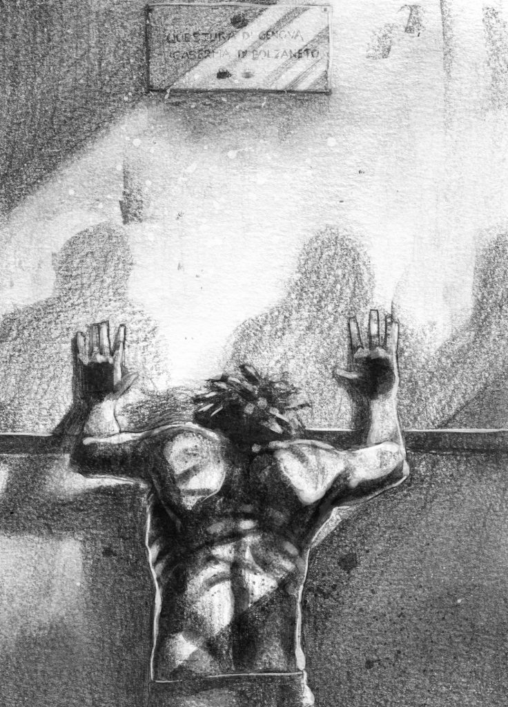 Nessuno spagnolo, nessun italiano, ma ragazzi attaccati a un rotolo di scotch, strappati, appesi al muro, violentati dalle forze dell’ordine nelle strade, nelle caserme, nelle scuole, dai media di regime, da tutti quei benpensanti che continuano a credere che se eri a Genova 2001 potevi morire, dovevi metterlo in conto, è inutile che fai finta di non essertela cercata, ti è andata solo bene che non ti chiamavi Carlo.