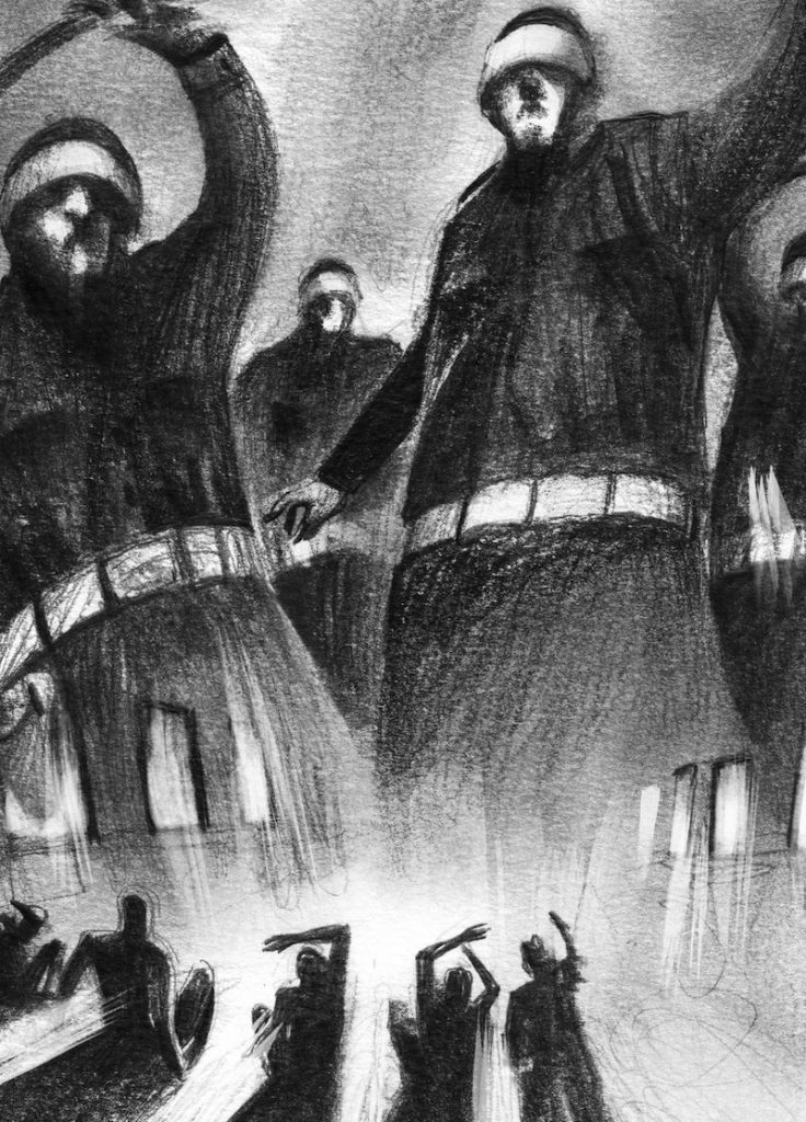 Il libro è arricchito da sette splendide illustrazioni di Paolo Castaldi, compresa la copertina. Graffi chiaro-scuri che restituiscono la misura dell’ingiustizia. Chi aveva ragione non ha volto: non ce l’ha Carlo dietro il passamontagna, non ce l’ha il ragazzo con il casco del Toro al fianco di Carlo, non ce l’hanno i muscoli tesi e le braccia contro il muro nella Caserma di Bolzaneto, e nemmeno quelle in copertina alzate contro il cielo. Chi aveva torto invece non ha occhi, è l’ombra cieca di se stesso.