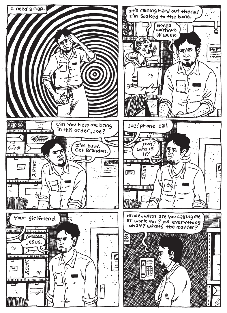 Distruzione. Il tratto distorto e tremolante di Van Sciver è esattamente quello che serve per questa storia. Joe lavora in un ristorante, abusa di alcool e si lamenta per la vita d’inferno che fa. Due donne sono parte della sua vita, la compagna sedicenne che accudisce il figlio e la suocera rimasta a corto di soldi e trasferitasi in casa loro. Entrambe riconoscono il suo spaccarsi la schiena, uscire la mattina, tornare la sera, i suoi sacrifici. Ma per cosa sacrifica la sua vita Joe? Lui è il primo a non saperlo. E allora prima di tornare a casa Joe affoga una vita di straordinari e sfruttamento al bar del ristorante in cui lavora, cercando nell’alcool risposte che non arrivano, aspettando invano una promozione. Van Sciver racconta la subalternità, la disintegrazione nel fisico e nello spirito di un giovane lavoratore precario, l’annullamento di ogni speranza di salvezza. I ruoli di genere sono ben definiti, forse fin troppo. Ma lo stereotipo è stereotipo perché si afferma, perché è reale, e in questa storia manca lo spazio e il tempo per combattere il patriarcato. Il maschilismo è vita. È dato culturale non giustificabile, ma vivo. Lei sta a casa, è responsabile, bada al figlioletto. Lui lavora, beve, si lamenta, molesta una collega. Eppure Van Sciver trova il modo di far esplodere la norma servendosi di un personaggio, questo sì, che evade con violenza lo stereotipo a lei attribuito. La suocera di Joe disintegra infatti l’ordinario, fugge il ruolo di madre e di nonna. Non è un caso se sarà proprio lei a scrivere il finale trasgressivo e provocatorio di questa storia.