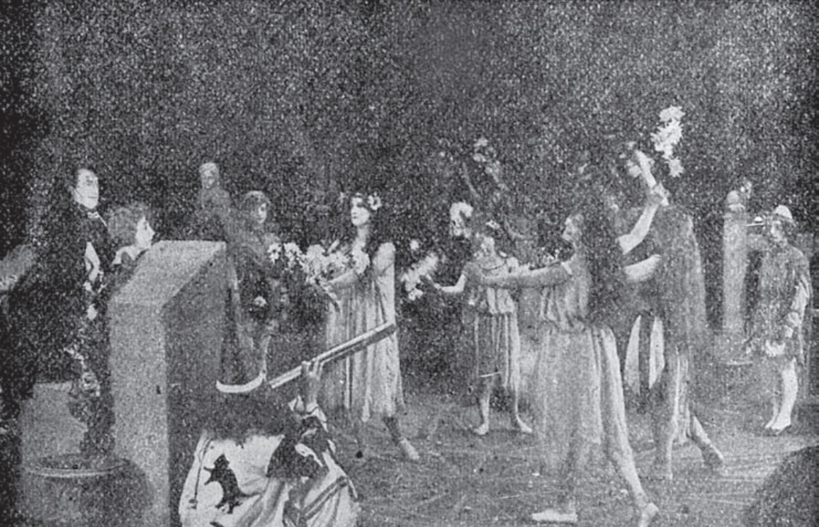 Partiamo da una foto: in un bianco e nero sgranatissimo, ma a suo modo straordinaria, onirica. Al primo colpo d’occhio notiamo una sorta di stilizzato baccanale di figure femminili (tre, a guardar bene) circondate da sagome sfuggenti: occupano due terzi dello spazio verso destra in un contesto di festa pagana tra fiori e musica – il capelluto in primo piano, che ostenta sulla schiena l’immagine di un gatto nero, pare stia suonando. Le tre donne e il seguito puntano verso sinistra: dove nel primo terzo della foto, dietro un parallelepipedo che forse è un altare, spicca una ragazza dallo sguardo straniato. Sta fissando quella festa per lei e per l’uomo tenebroso in piedi alle sue spalle con aria soddisfatta. È una festa di nozze.