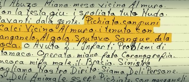 “Era pieno di assistenti tutti incappucciati, erano da tutte e due le parti e tu dovevi entrare nel mezzo, fare 10 o 15 metri, così dritto, poi spogliarti nudo praticamente per farsi controllare. Quello ci stava a controllarmi nudo … Ho detto va bene, va. Fin qui ci sta, qualche schiaffo. Poi da lì non ho capito più niente. Non ho capito come hanno fatto loro ad essere così crudeli”.