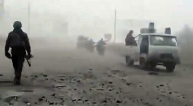 Gli uomini in mimetica camminano soli o a coppie dentro fitti banchi di nebbia, a malapena si intravedono i campi desolati attorno alla lingua di cemento. La colonna di fanti è accompagnata da moto da cross e automobili civili senza più sportelli, cariche di individui armati col volto coperto. Un drone riposa poggiato sull’asfalto.