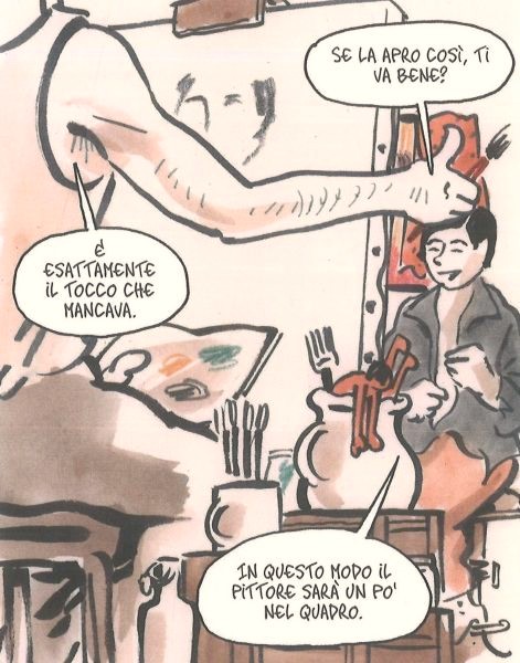La maestria stilistica è notevole. Qui, di Due ragazze nude, segnaliamo le inquadrature originali, le tonalità calde e spesso smorzate – forse un rimando al supporto del quadro di Mueller, tela di iuta – , la rarità studiata dei rossi intensi, un verde enigmatico. Soprattutto è il punto di vista, che incanta. Come ripresa cinematografica si direbbe soggettiva. Il quadro è l’occhio che guarda ogni cosa: chi legge il fumetto diventa il quadro. Ecco spiegate le angolature insolite, i ritagli del campo visivo, l’improvviso inclinarsi o abbuiarsi dell’immagine. Così, chi legge si mette a nudo e si sdoppia.
